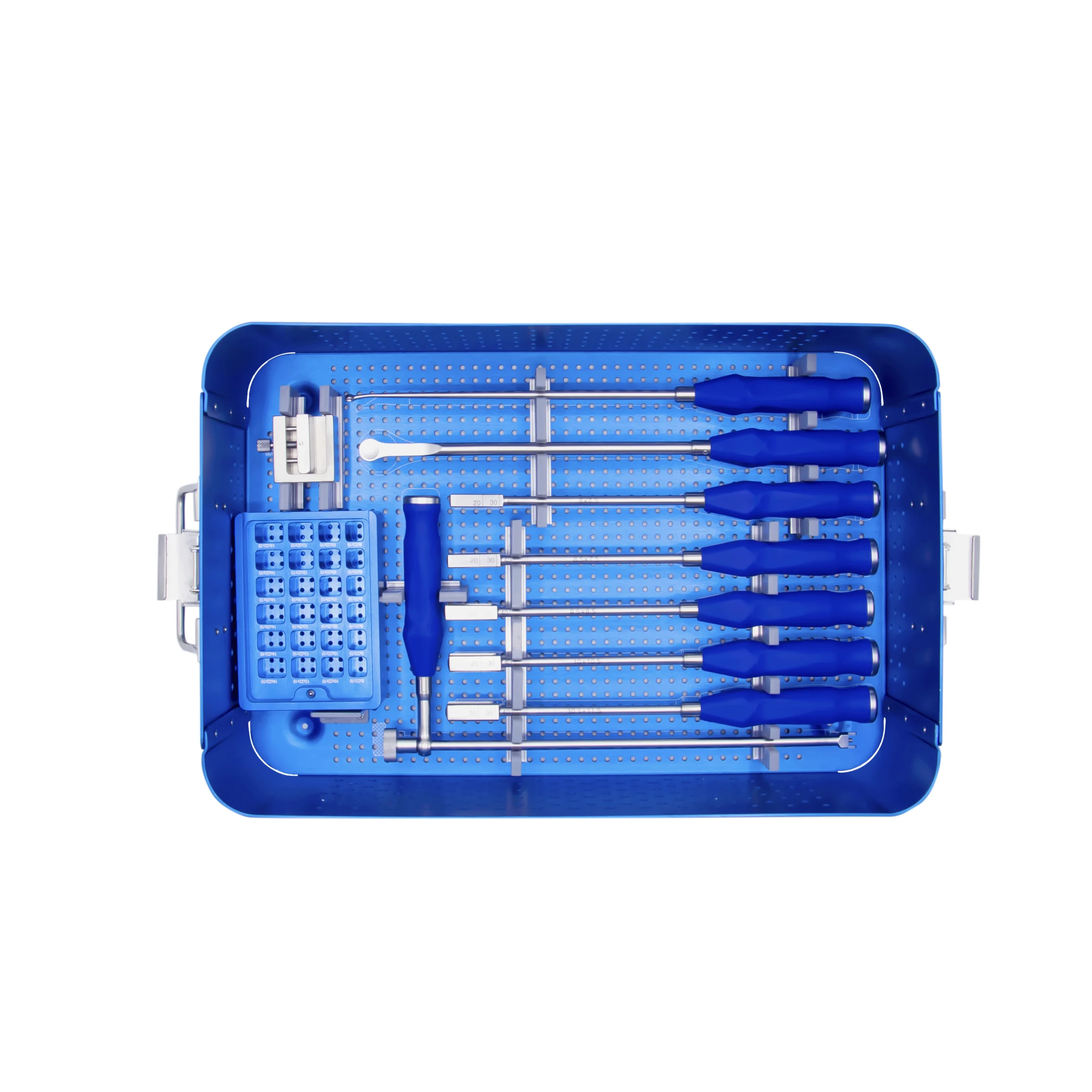 The entire set is housed in a professional graphic sterilization case. Made from anodized aluminum and high-performance polymers, the case is lightweight yet extremely durable. It features custom silicone brackets that hold each instrument in place, preventing damage to delicate tips and ensuring effective steam penetration during autoclaving.